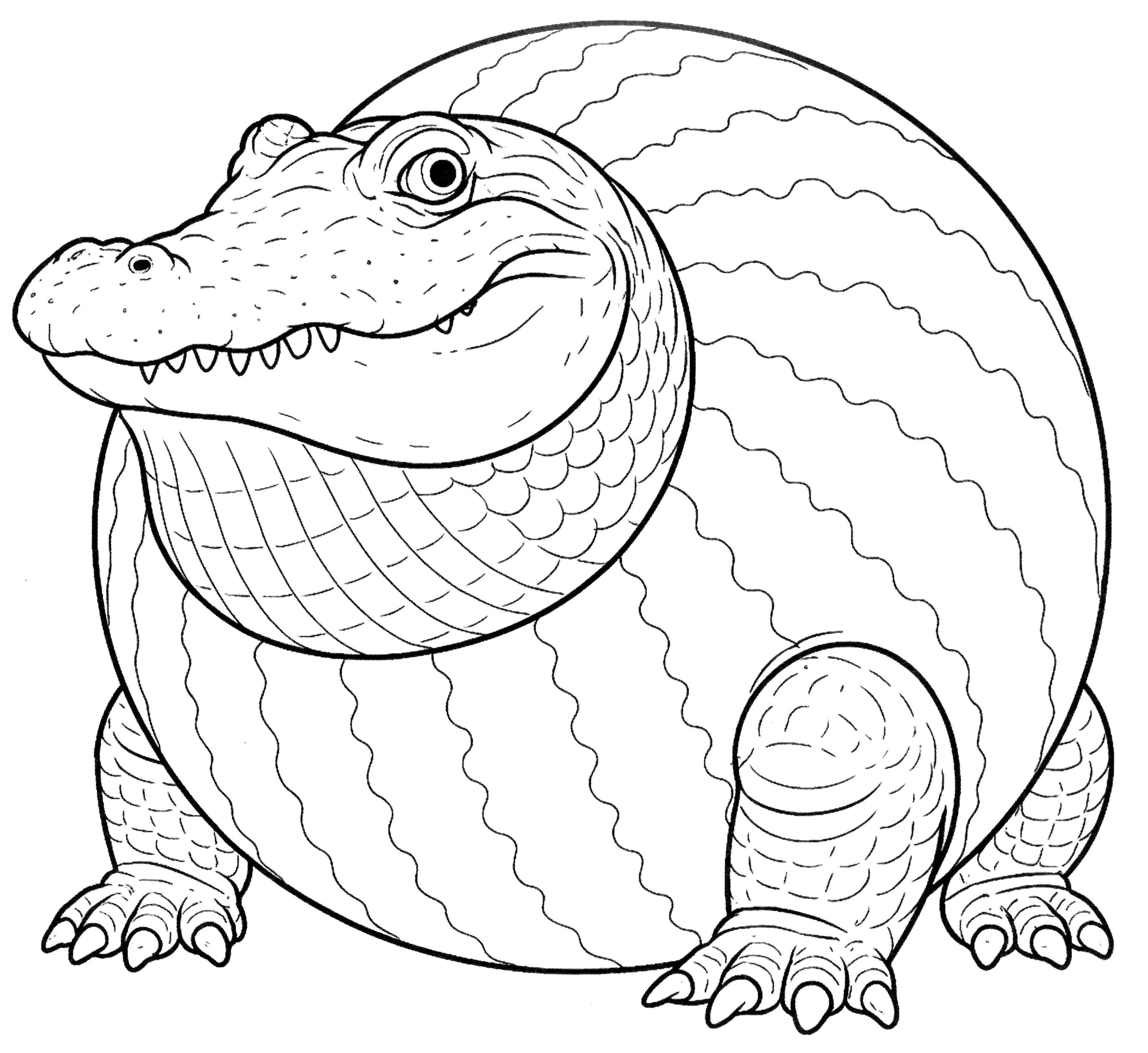 Арбузный крокодил, круглый и сочный, смотрит с хитрой улыбкой. Он точно знает, что лето — время приключений. Подбери самые яркие цвета для него!