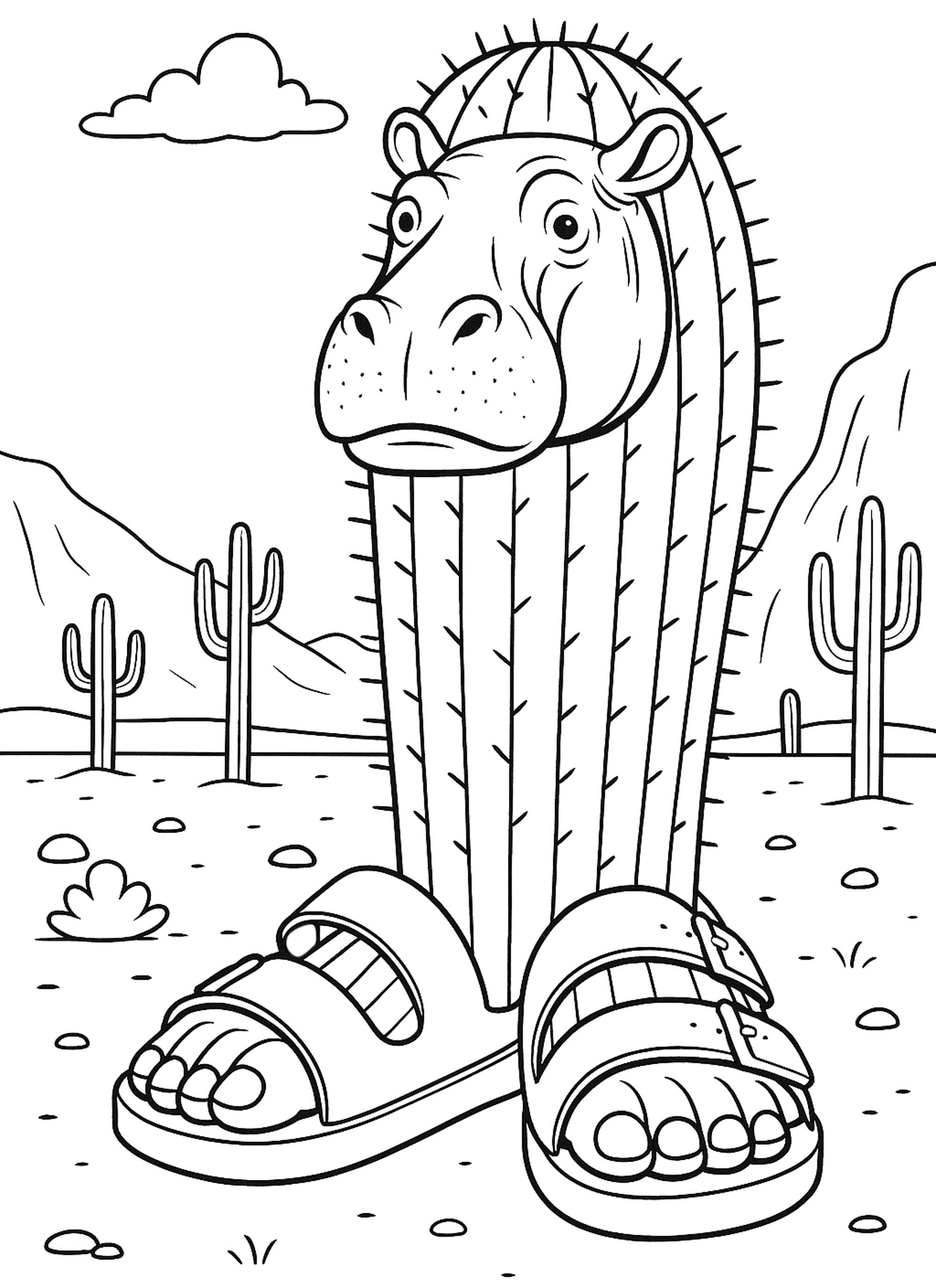Смешной гибрид гиппопотама, кактуса и… ортопедических сандалий. Он колючий снаружи, но добрый внутри! Раскрась его, кактус пусть будет ярко-зелёным, а сандалии — по твоему вкусу.