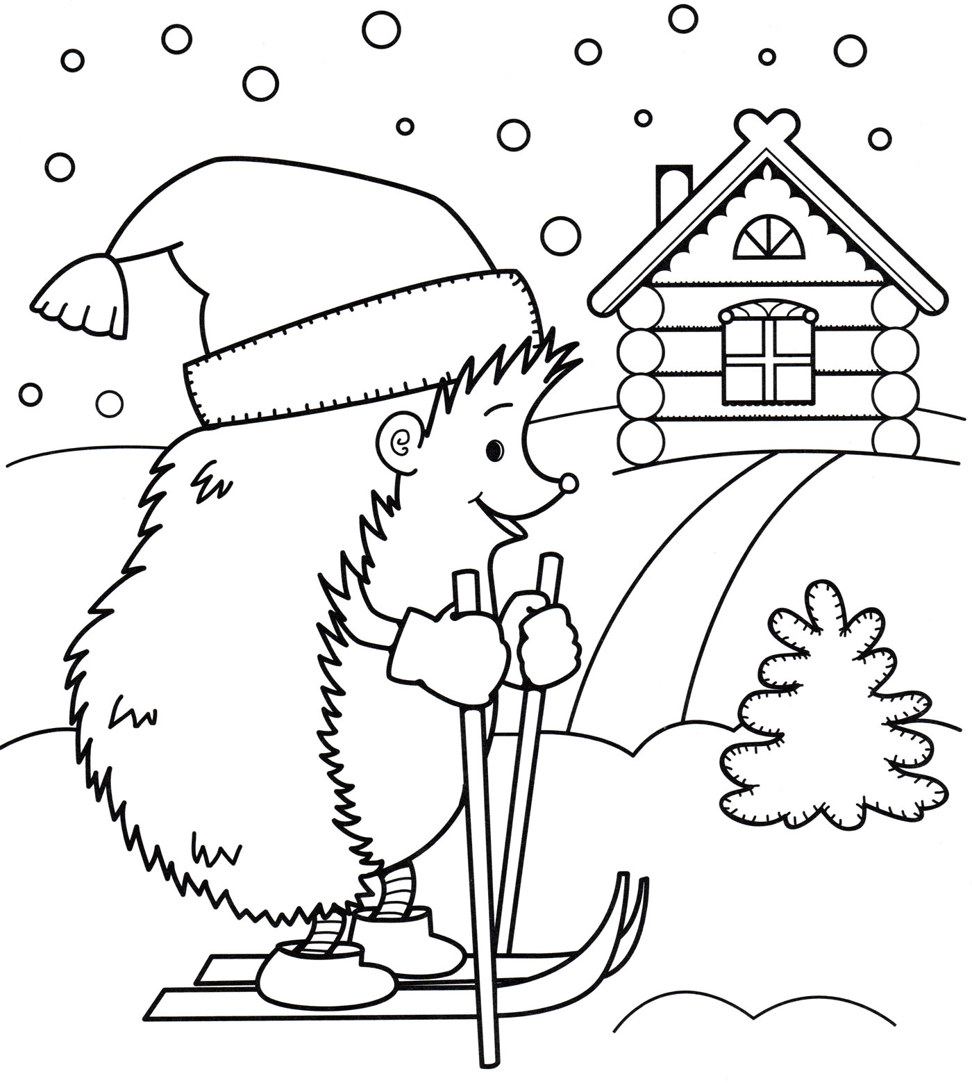 Ёжик на лыжах уже далеко отошел от своей избушки. Куда направляется забавный зверек в шапочке, варежках и валенках? Расспросите ежа, когда будете раскрашивать его карандашами или красками.