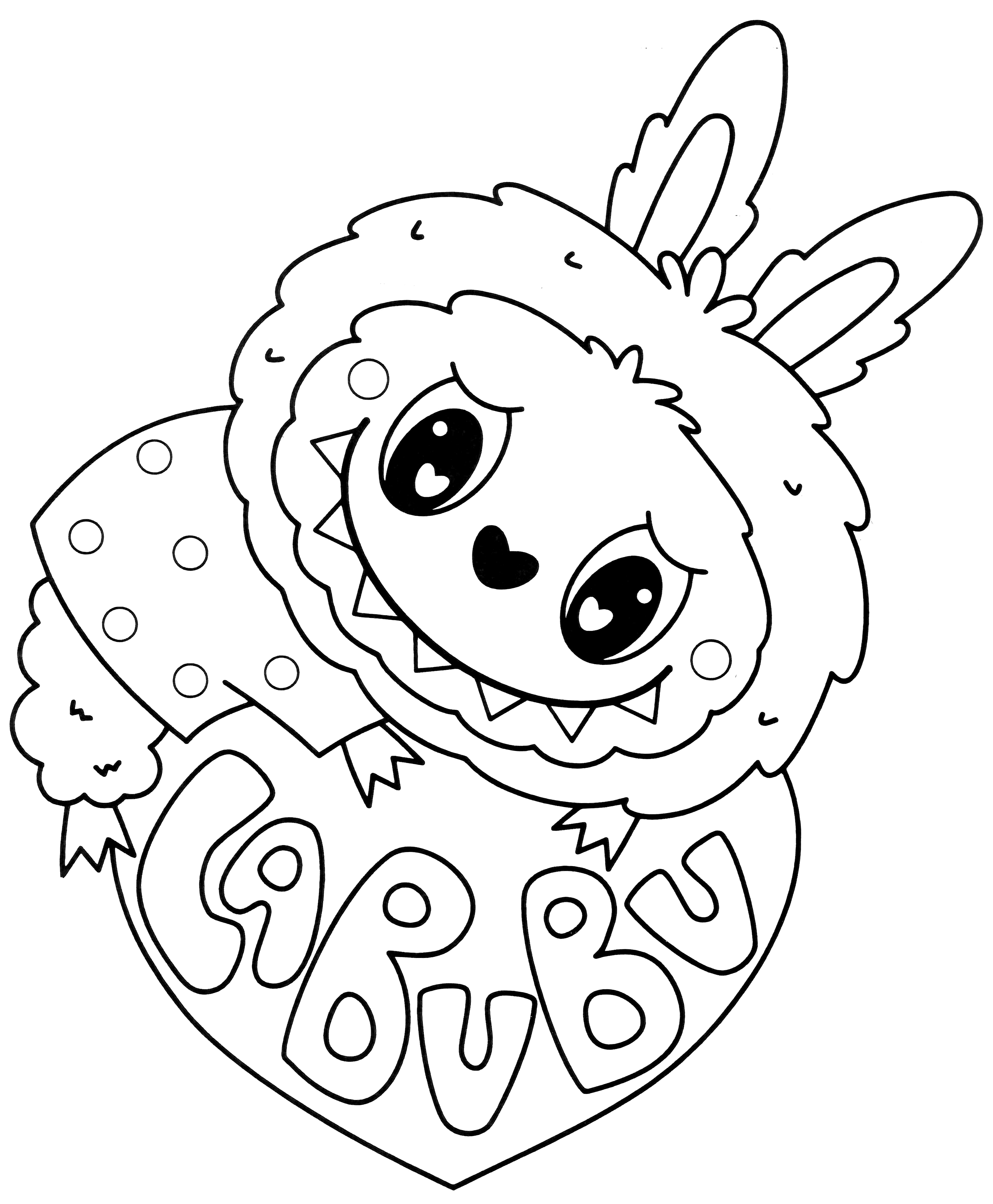 Весёлая Лабубу выглядывает из-за большого сердечка, на котором написано её имя. Она одет в рубашку в горошек и улыбается своими острыми зубками. Раскрась картинку яркими цветами и сделай сердечко ещё более тёплым!