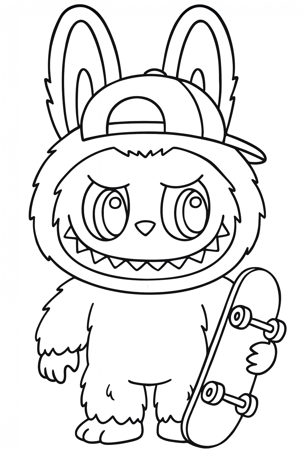 Лабубу готов к трюкам и весёлым заездам! На голове у него кепка, в лапе — скейтборд. Может, ты раскрасишь его как настоящего уличного скейтера? Придумай крутые цвета и оживи картинку своим стилем!