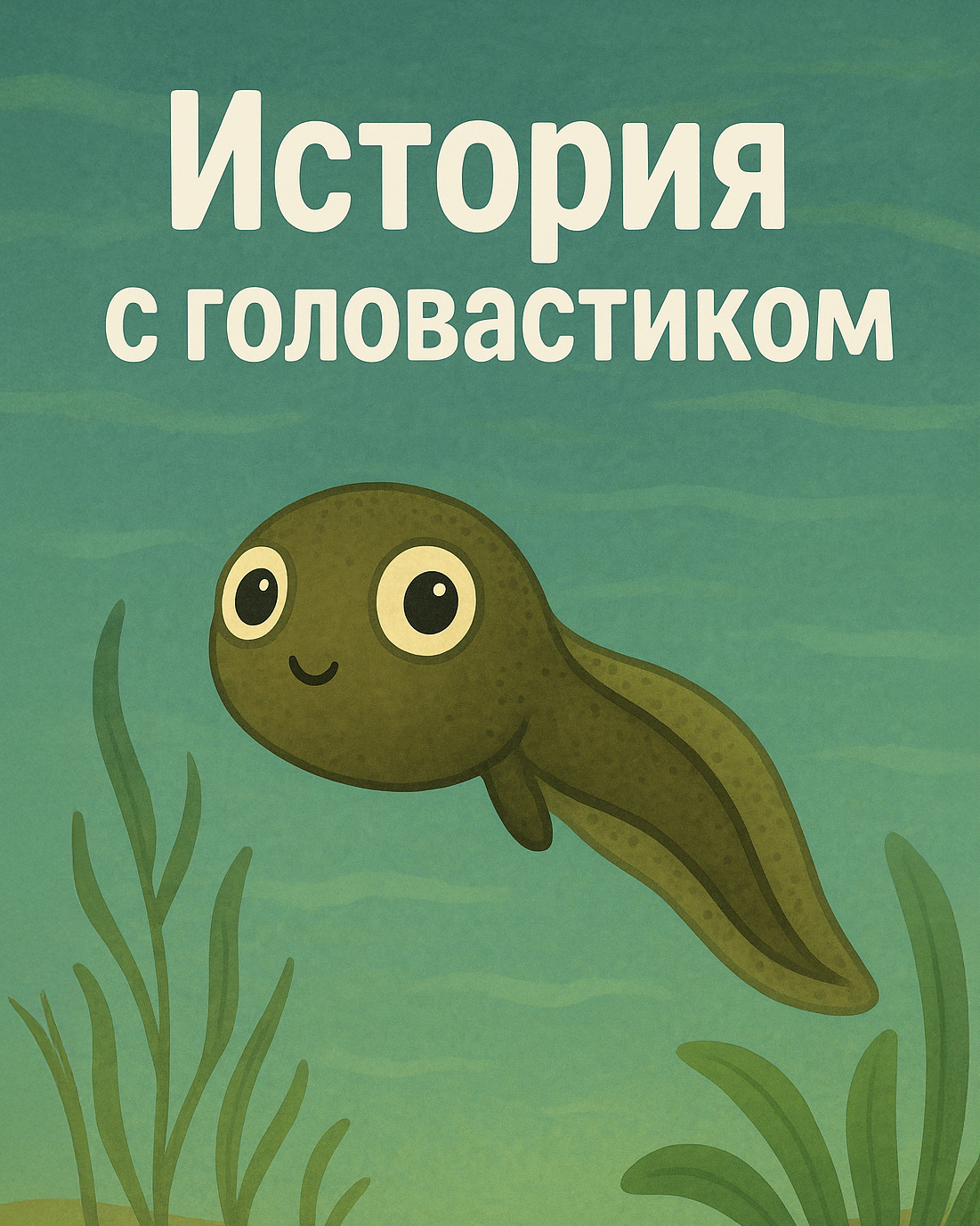 Его называют просто — головастик, называют за то, что у него и вправду большая голова. Ножек у него нет, зато есть хвостик, с помощью которого он плавает.
