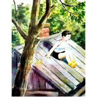 Вот там, на Волге, в землянке, на самом волжском берегу — в крутом обрыве, живёт сторож-бакенщик. Посмотришь с реки — увидишь только окно да дверь. Посмотришь с берега — одна железная труба торчит из травы. Весь дом у него в земле, как звериная нора.