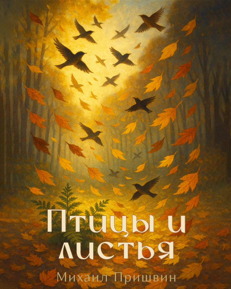 А на большой лесной поляне и упавшие листья не находят покоя: одни, как мыши, перебегают поляну, другие хороводом кружатся, вихрятся, носятся и, когда попадают в течение ветра над лесом, опрометью мчатся под синими, почти черными тучами и между ними голубыми сияющими небесными полянками, и тут уже не поймешь, где листья мчатся, а где перелетные птички.
