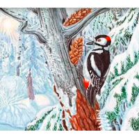 Миновали поле и въехали в лес. Он весь блестел и искрился под луною. По сторонам возвышались, казалось, не деревья, а чудесные дворцы с белыми сверкающими шпилями, башенками. А под ними темнели глубокие синие пещеры. Все замерло, застыло.