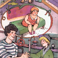 Дедушка Валя подмигнул маме, закашлялся, взял чемодан, и мы вышли в открытую дверь. Вдалеке стоял какой-то самолетик, похожий на стрекозу, только на журавлиных ногах. Впереди шли все наши знакомые: Колесо, Мешок с поросенком, Розовые Рубашонки, Гусеничка. И скоро мы пришли к самолету. Вблизи он показался еще меньше, чем издали. Все стали в него карабкаться, а мама сказала: