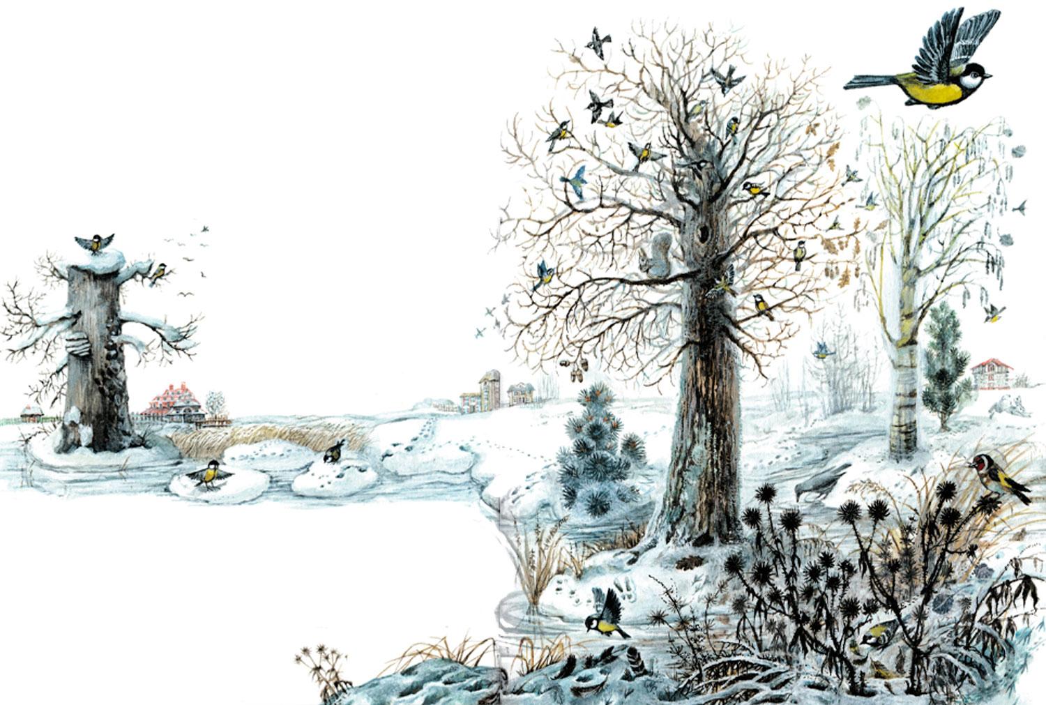 — Ну вот, запомни: январь — первый месяц года — начинается с веселой елки у ребят. Солнце с каждым днем понемножечку начинает вставать раньше и ложиться позже. Свету день ото дня прибывает, а мороз все крепчает, небо все в тучах. А когда проглянет солнышко, тебе, синичке, хочется петь. И ты тихонько пробуешь голос: «Зинь-зинь-тю! Зинь-зинь-тю!»