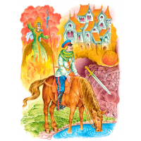 Иван — купеческий сын надел ту рубашку, сел на богатырского коня и поехал сватать за себя Елену Прекрасную; а об ней было по всему свету объявлено: кто победит Змея Горыныча, за того ей замуж идти.