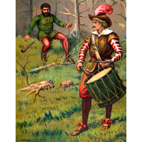 Человечек сидел и удил рыбу, а ветер, к несчастью, запутал его бороду в леске, и когда клюнула большая рыба, у карлика не хватило сил ее вытянуть; рыба была сильнее его и тянула карлика за собой. Как ни хватался он за траву и за камыш, ничего поделать не мог, и пришлось бы ему нырять вслед за рыбой, вот-вот утащила бы она его в воду. Девочки подоспели как раз вовремя, подхватили карлика и стали бороду из лески выпутывать; но ничего у них не выходило, борода и леска крепко перепутались. Оставалось только одно — достать небольшие ножницы и отрезать бороду, — вот и пропал еще кусок бороды. Увидал это карлик, начал на них кричать: