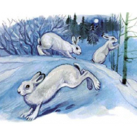 «Назад, назад!» — и увидали, что скачет охотник, а впереди его две собаки увидали котёнка и хотят схватить его. А котёнок глупый, вместо того чтобы бежать, присел к земле, сгорбил спину и смотрит на собак.