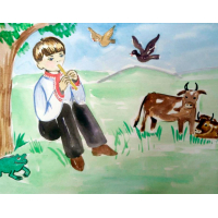 Достал дед из кармана кисет с табаком, сам понюхал и волку дал. Как нюхнул волк во весь дух, так весь кисет табаку и вдохнул. А потом как начал чихать на весь лес… Ничего от слез не видит, всё чихает. Так чихал с час, пока весь табак не вычихал. Осмотрелся, а деда уж и след простыл. Пошел волк дальше. Идет он, идет, видит — на поле стадо овец пасется, а пастух спит. Высмотрел волк в стаде самого лучшего барана, схватил его и говорит: