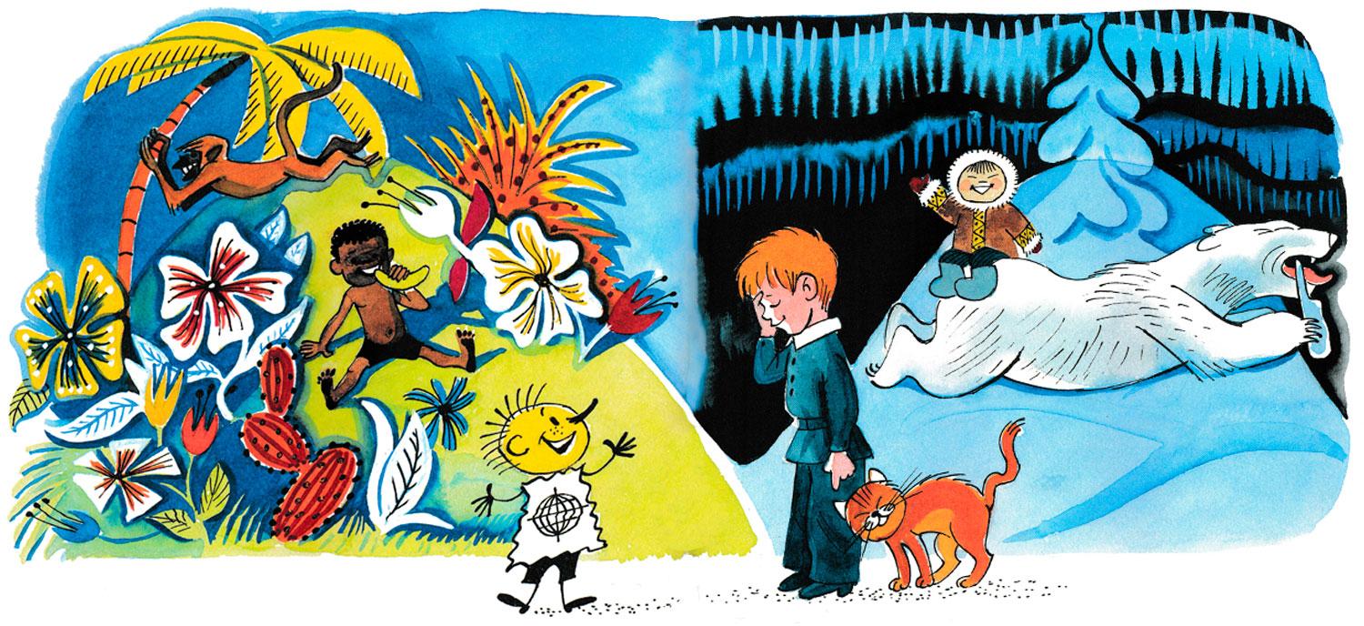 Я так и сделал. Теперь на Жаркой горе сидел негритенок, ел банан и улыбался. Обезьянка взобралась на пальму и корчила смешные рожицы. Потом я взглянул на Холодную гору. Там развалился на льду белый медведь. Наконец-то его перестала мучить жара. Маленький чукча махал мне меховой рукавичкой.