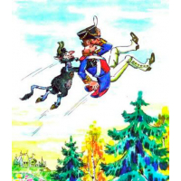 Баба-яга вышла на двор, свистнула - перед ней явилась ступа с пестом и помелом. Промелькнул красный всадник - взошло солнце. Баба-яга села в ступу и выехала со двора, пестом погоняет, помелом след заметает.